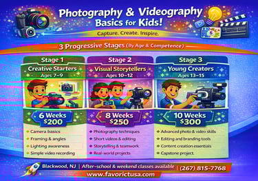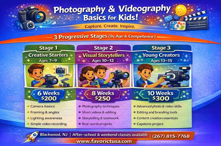 Kids learn camera basics, framing, lighting awareness, and simple video recording while developing creativity and confidence.