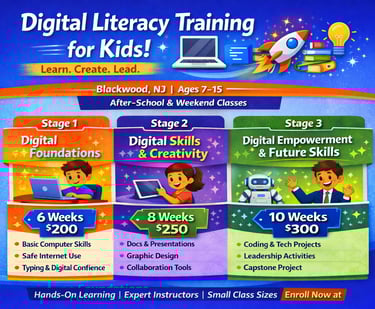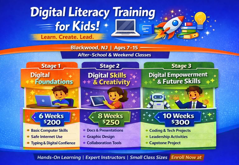Equip your child with essential technology skills for today and the future. Our Digital Literacy Training helps kids build confidence, creativity, and responsible digital habits through hands-on learning in a supportive environment.